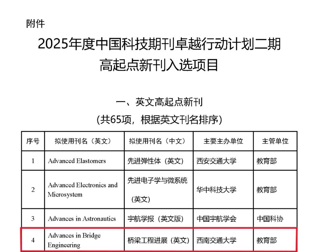 12月5日,中国科技期刊卓越行动计划二期高起点新刊正式公布,《Advances in Bridge Engineering》(桥梁工程进展)国际期刊成功入选。在西南交通大学及 艳母