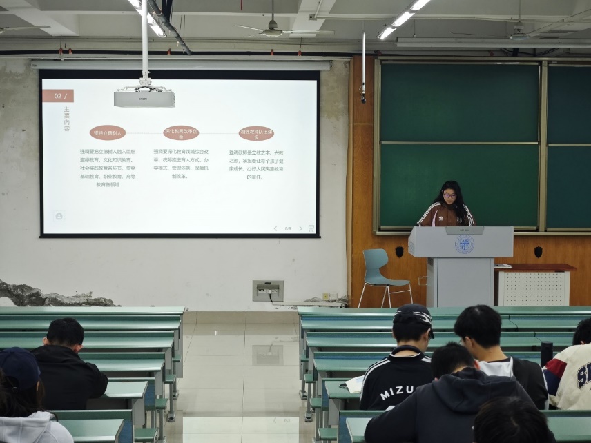 在每个小组展示结束后,王森老师逐一对各组的展示进行点评,肯定了大家对讲话精神的理解和展示形式的创意。他特别强调,作为入党积极分子,大家应时刻牢记“教育强国”的目标,将自身发展与国家命运紧密联系在一起,用实际行动谱写新时代的青春篇章。