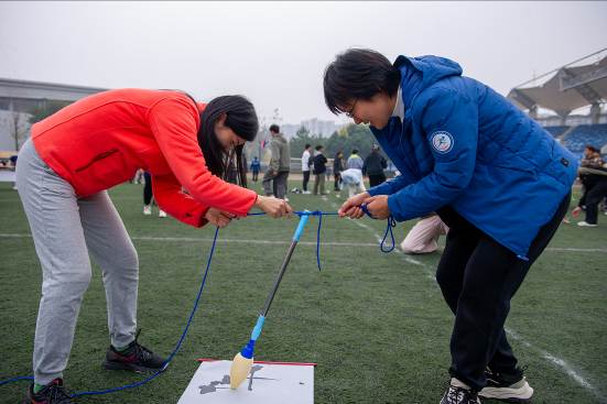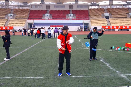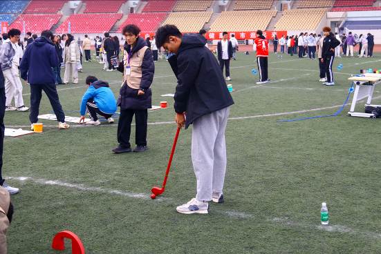 趣味项目环节中,在“同心筑塔”游戏,8位队员默契配合,靠道具搭起“高塔”,稳立5秒的瞬间,欢呼声响彻赛场;在“稳如磐石”桩旁,5位队员相互搀扶,默契配合;在“妙笔生花”纸上,全员拉绳书写主题词,考验团队协作;在“捶丸”洞前,认真瞄准,顺利进洞;在“空竹”旋转过程中,考验同学们的平衡操控力。