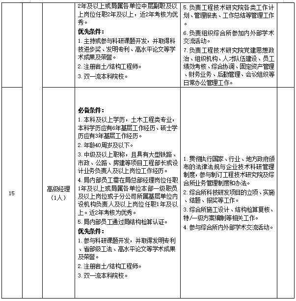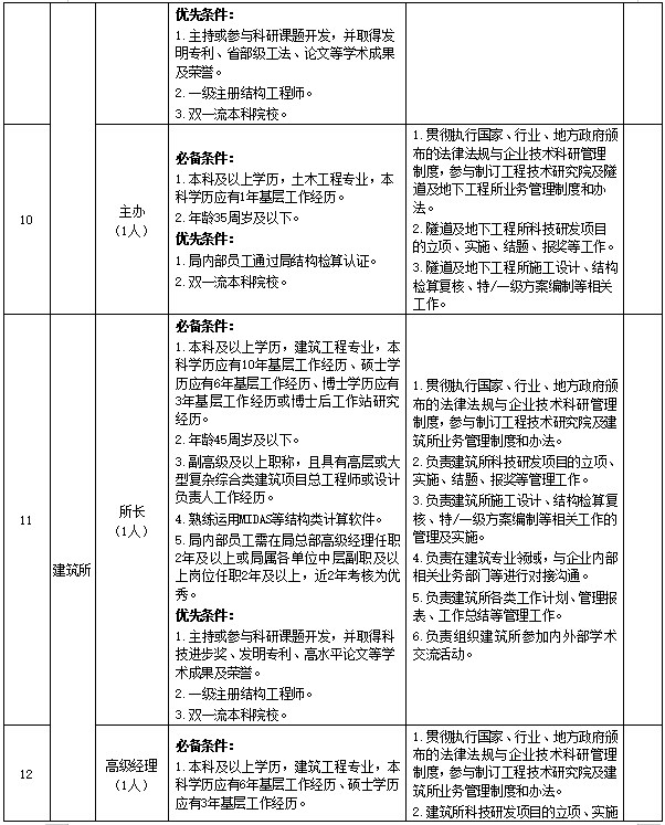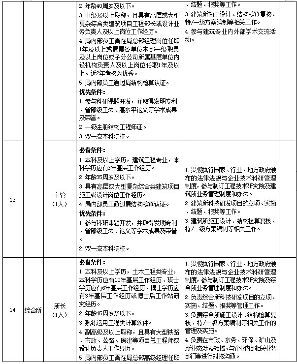 中铁四局集团工程技术研究院主要负责工程实用技术、关键建造技术及工程装备等创新研究,承担局重特大施工技术方案咨询解决及成果孵化相关工作。根据发展需要,现面向局内外公开招聘研究人员,现将有关招聘事项公告如下:
