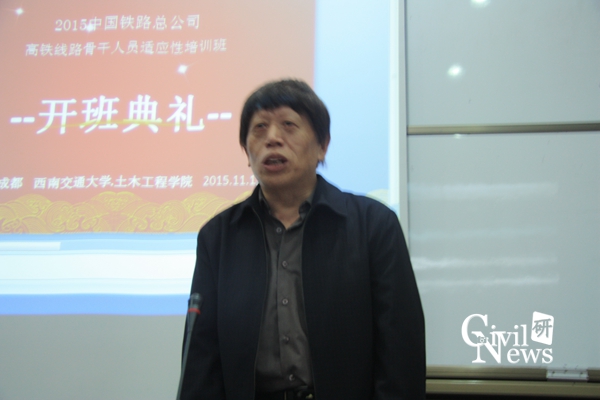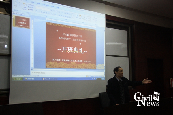 11月18日上午8:30,2015年中国铁路总公司“高铁线路骨干人员适应性培训班”开班典礼在西南交通大学九里校区0224教室隆重举行。 艳母 任宝良副院长、 艳母 继续教育中心江富长书记以及各个铁路局学员出席了此次开班典礼。此次培训班的学员主要由来自各铁路局及铁路集团的领导和高铁线路骨干人员组成,培训的目的是针对当前高铁工程一线生产作业状态,与学员一起学习研讨相应实际问题,提高学员的适应性能力,为以后的高铁生产作业提供理论和技术的双向支持。