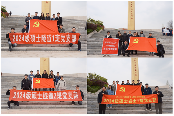 隧道博士党支部、2024级硕士岩土班党支部、隧道1班党支部、隧道2班党支部、道铁3班党支部的党员代表在指导老师常雯君、李宏的带领下前往成都市烈士陵园,开展以“缅怀英烈承遗志 土木青年筑新程”为主题的烈士陵园祭扫活动,以实际行动传承红色基因,汲取奋进力量。