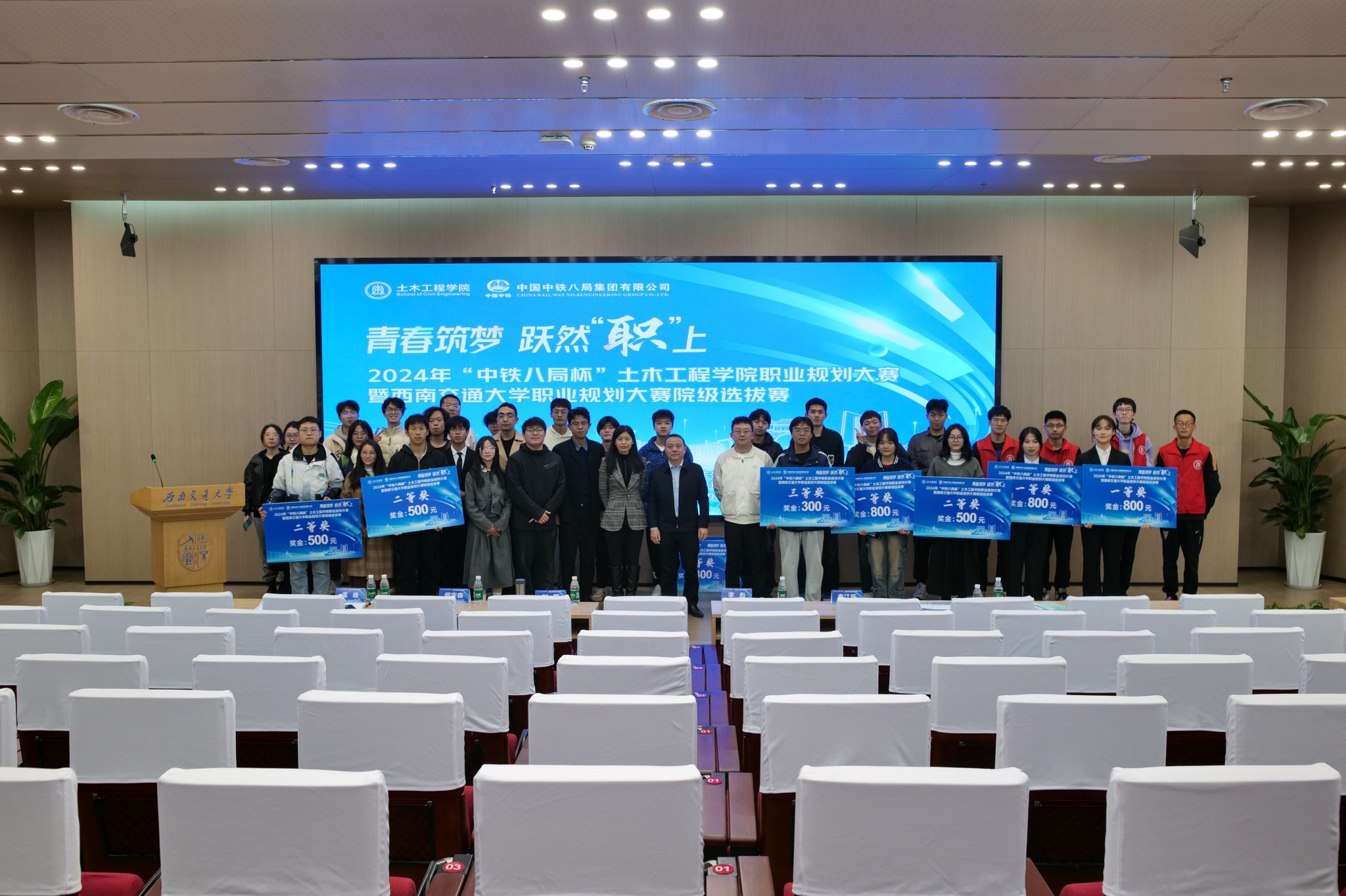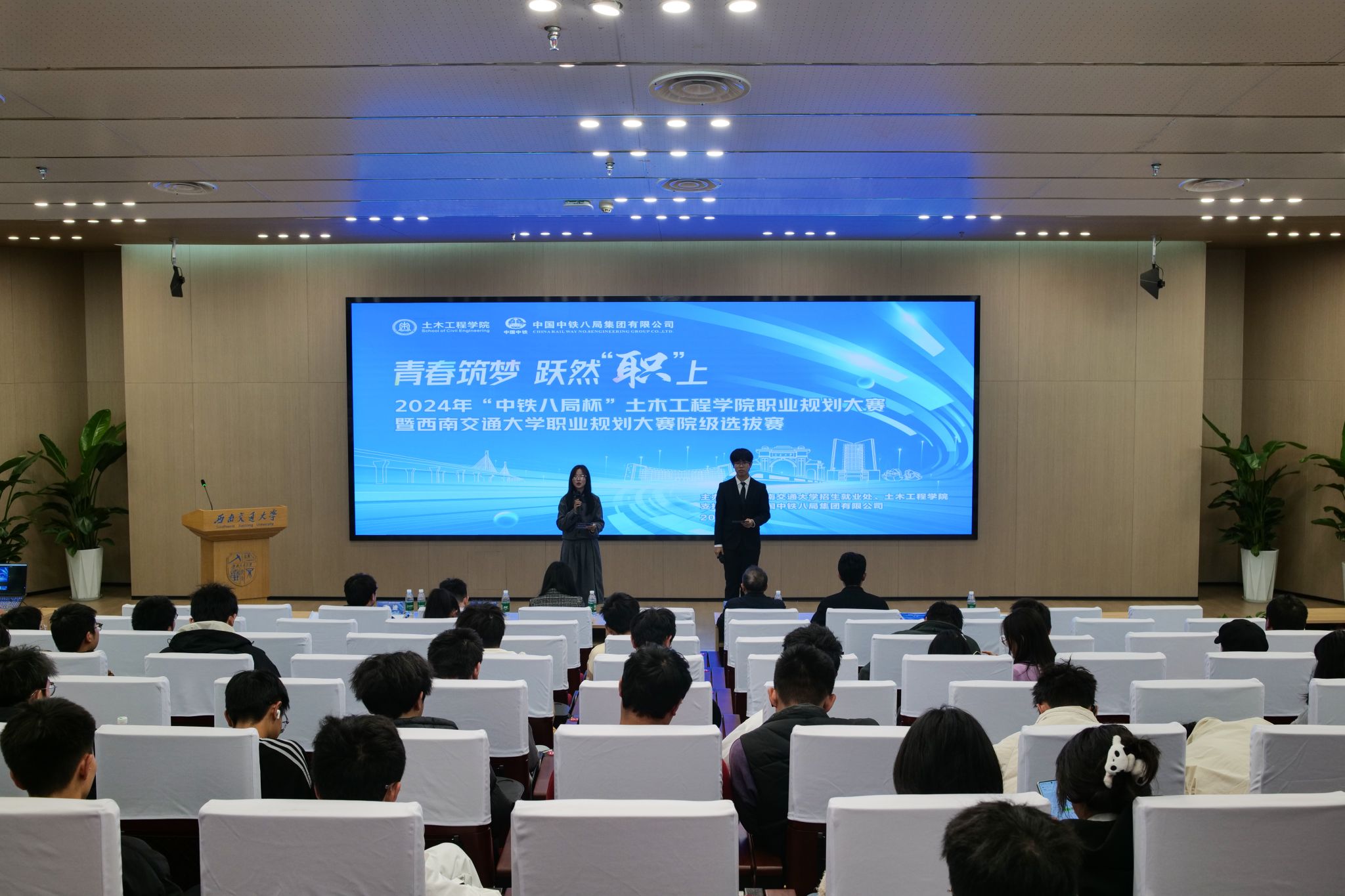 职业规划大赛在西南交通大学犀浦校区图书馆二号报告厅顺利举行。本次大赛作为学校职业规划大赛院内选拔赛,旨在引导大学生树立正确的成才观、就业观和择业观,科学合理规划学业与职业发展,提升就业竞争力。中铁八局城市轨道交通分公司副总经理李彪、 艳母