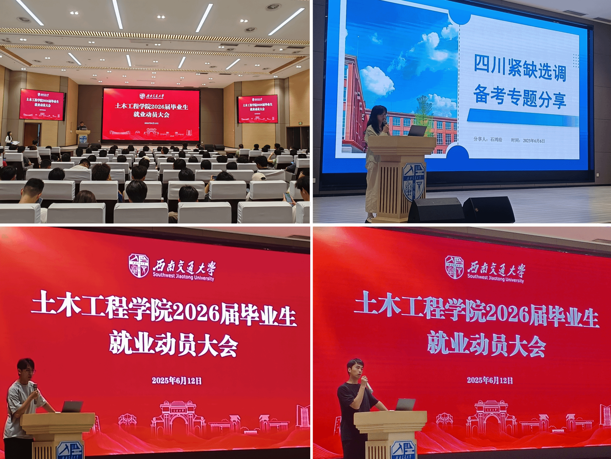 在就业专场的经验分享环节,学院特别邀请了三位2025届优秀毕业生代表进行现场交流。签约中国铁路郑州局集团有限公司的习丹阳同学分享了铁路系统求职经验,重点介绍了笔试准备和面试技巧;成功考取四川省内江市选调生的石鸿给同学系统讲解了选调生备考策略和面试经验;签约广东省铁路建设投资集团有限公司的耿浩楠同学则从专业技能准备和职业发展规划角度分享了心得。