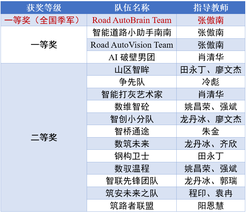 在此次赛事中的亮眼名片;同时,4项一等奖的荣誉还包括张傲南教授指导的“智能道路小助手南南”“Road AutoVision Team”两支队伍,以及肖清华教授指导的“AI破壁男团”。此外,田永丁等14位老师指导的12个团队进阶决赛后均顺利拿下二等奖,尽显艳母