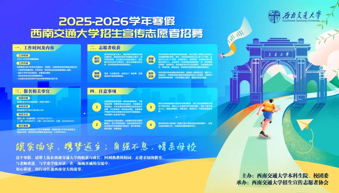自1896 年建校,西南交通大学历经一百二十九载春秋,从山海关一步步迁至成都,积淀了深厚的办学底蕴。每一位交大学子,都是学校与生源中学温暖的情感纽带。为进一步提升学校知名度与办学影响力,扎实推进本科生招生宣传冬招积淀行动,并为大家提供感恩母校、锻炼自我的实践平台,西南交通大学招生宣传志愿者协会决定实施“寒假高中母校行”品牌活动,现面向全校招募 2025—2026 学年寒假招生宣传志愿者。现将有关事宜通知如下: