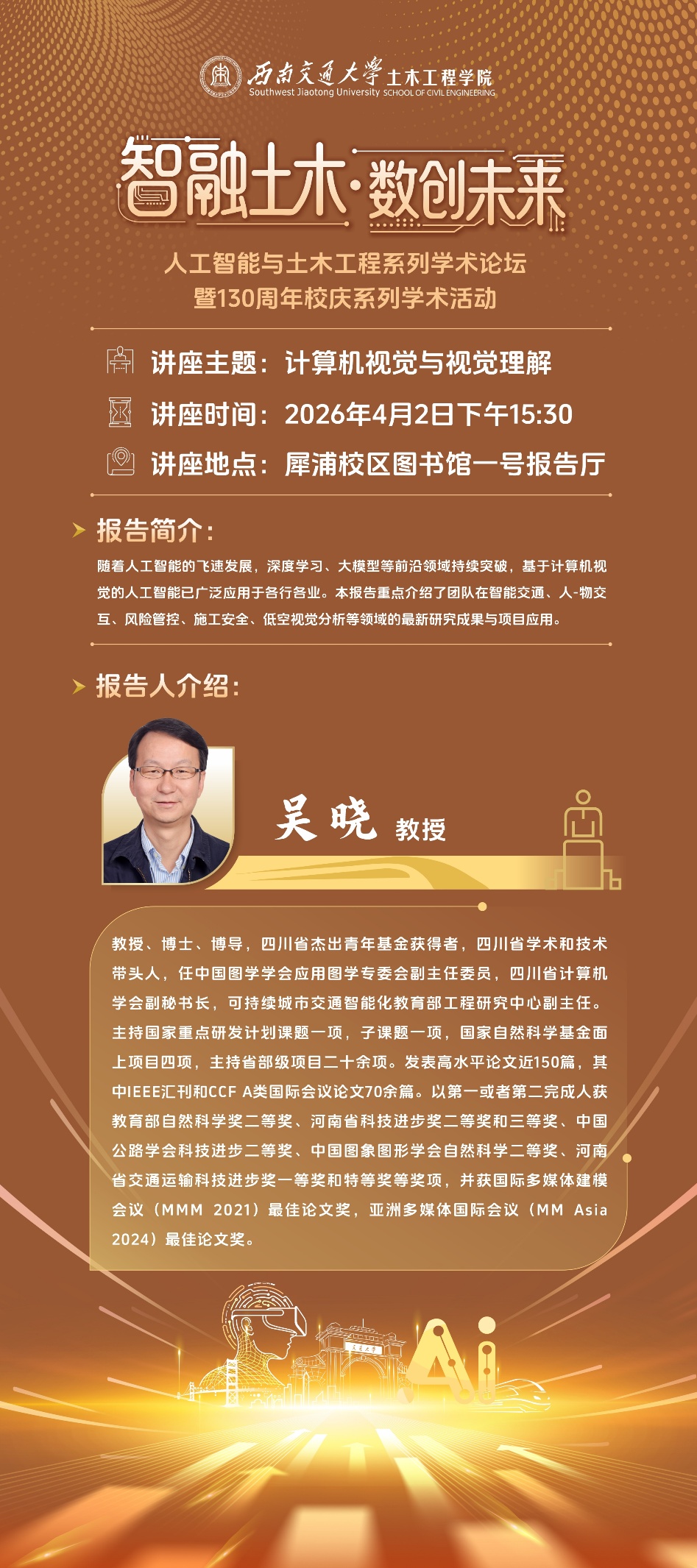 为推动人工智能技术与土木工程领域的深度融合,助力学院教职工拓宽科研思路、提升学术素养,搭建院内学术交流与成果共享平台,学院特举办“智融土木·数创未来——人工智能与土木工程系列学术论坛暨130周年校庆系列学术活动(第一场)”。具体事宜通知如下: