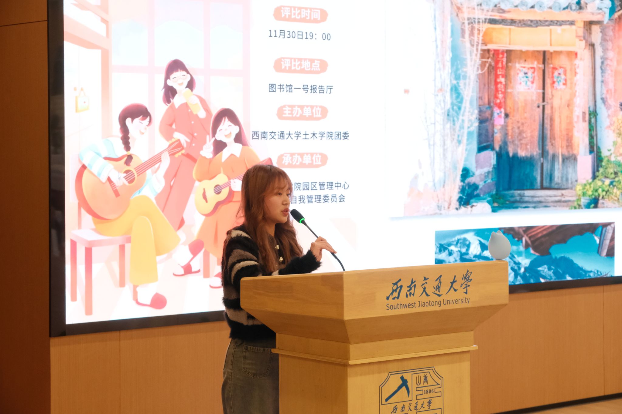 团委主办、土木园区管理中心承办了“小城风物”寝室装潢大赛决赛,11月30日晚七点,本次大赛在图书馆1号报告厅顺利举行。党委学生工作部宿舍园区学生管理科刘颖、罗邱、王一哲, 艳母