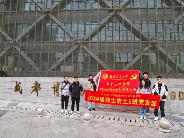 2024级硕士岩土1班党支部成员来到成都市博物馆,开展了校级党支部示范活动“红心铸魂”系列中的“红旅印记”红色教育基地线下参观活动。本次活动旨在让党员同学深入了解成都的历史文化,重温革命先辈为民族独立和人民解放所做出的巨大贡献,从而进一步坚定党员理想信念、增强党性修养,并通过学习历史提升文化自信,凝聚党支部力量。