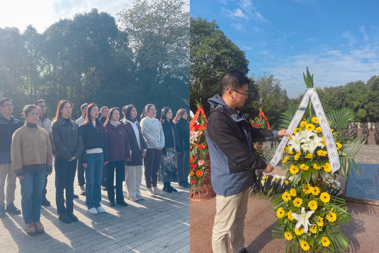建川博物馆“中国壮士1931-1945群雕广场”上矗立着216位抗战名将和著名烈士,如左权、张自忠、赵一曼等,为全球规模最大的二战题材雕塑群,属建川博物馆抗战系列场馆组成部分。晨曦中,支部党员肃穆而立,书写着“革命先烈 永垂不朽”缎带的花篮缓缓放置在纪念雕塑前,陆研中心党支部杨长卫书记上前认真整理花篮缎带,全体党员默哀并鞠躬致敬。
