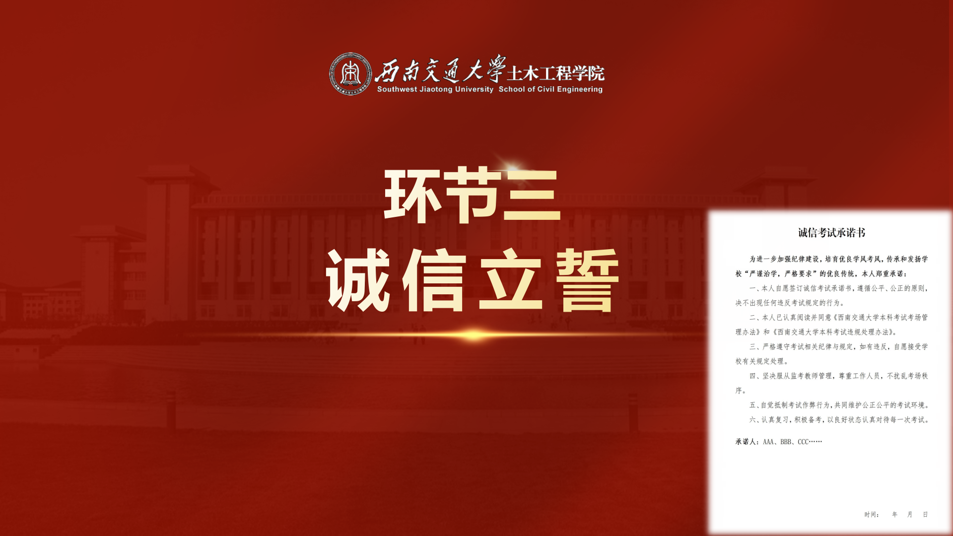 紧扣党的二十届四中全会“统筹发展和安全”的重要要求,结合大学生“诚信为本、勤勉为要、自律为基”的立身准则,支部全体成员共同签署《诚信考试承诺书》。党支部成员郑重承诺遵守考场纪律、抵制作弊行为、以诚信应考践行初心使命。
