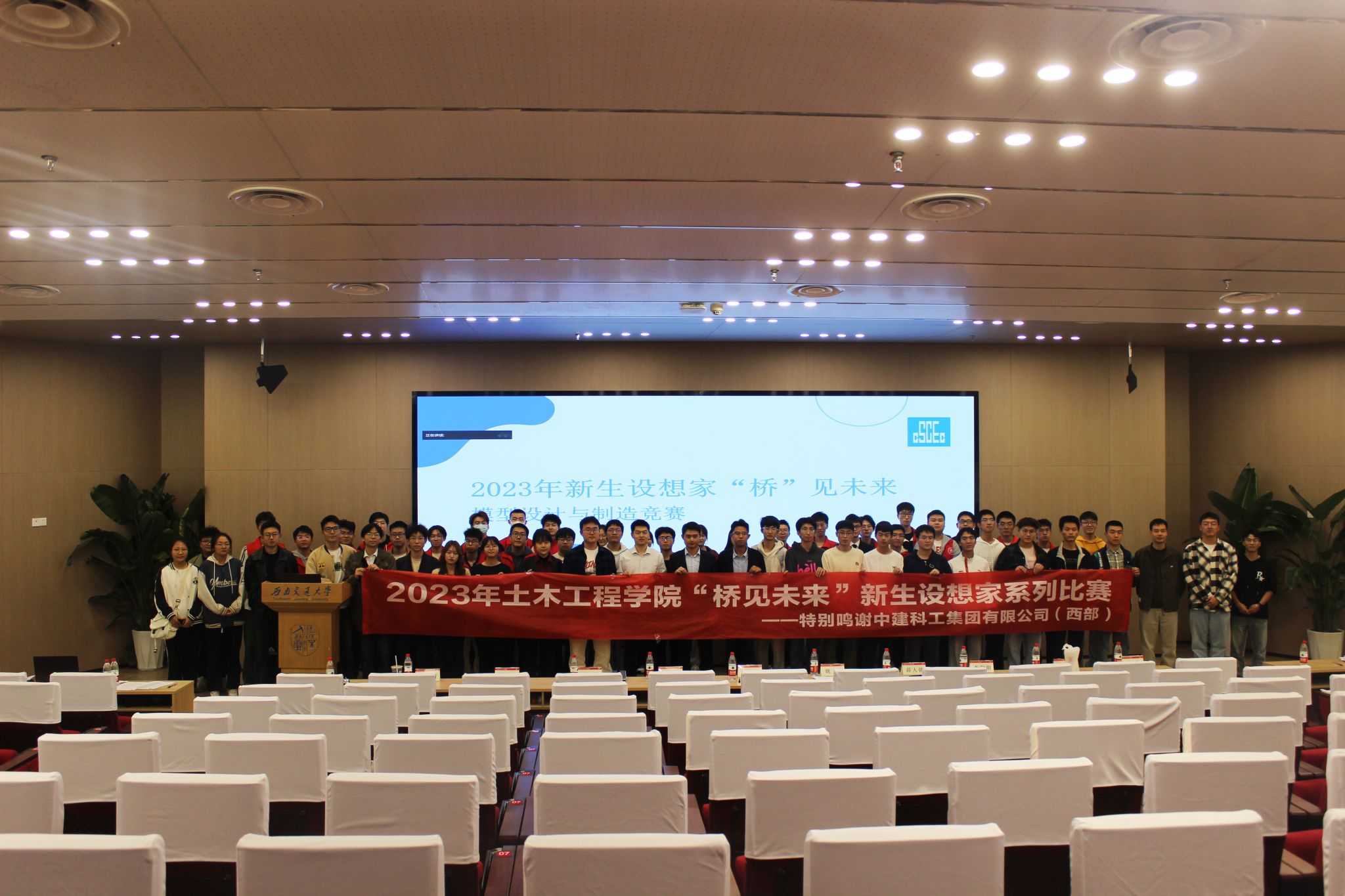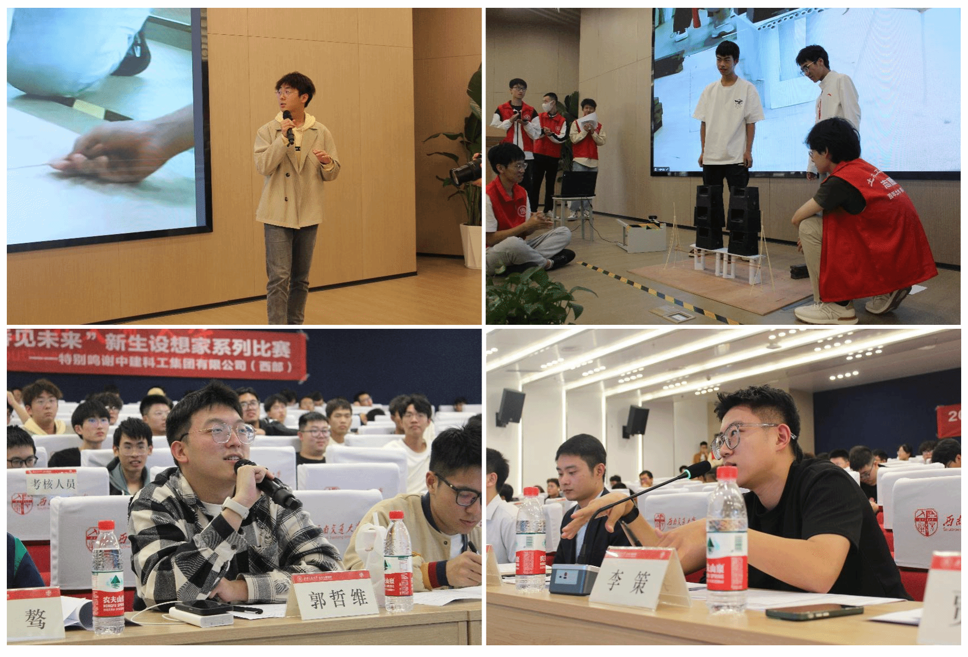 犀浦校区图书馆二号报告厅举行。中建科工四川公司天科创智项目总工程师、学院青年讲师团成员张炳宏,中建科工集团四川公司人力资源管理部人力专员姚军,学院辅导员老师李江怀,薛人铭,谢宇清,贾璇琦,李策,郭哲维,李阳阳出席决赛现场。