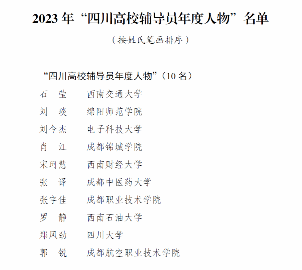 辅导员石莹老师获评“四川高校辅导员年度人物”。
