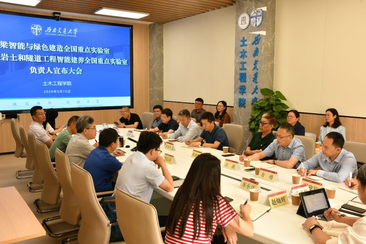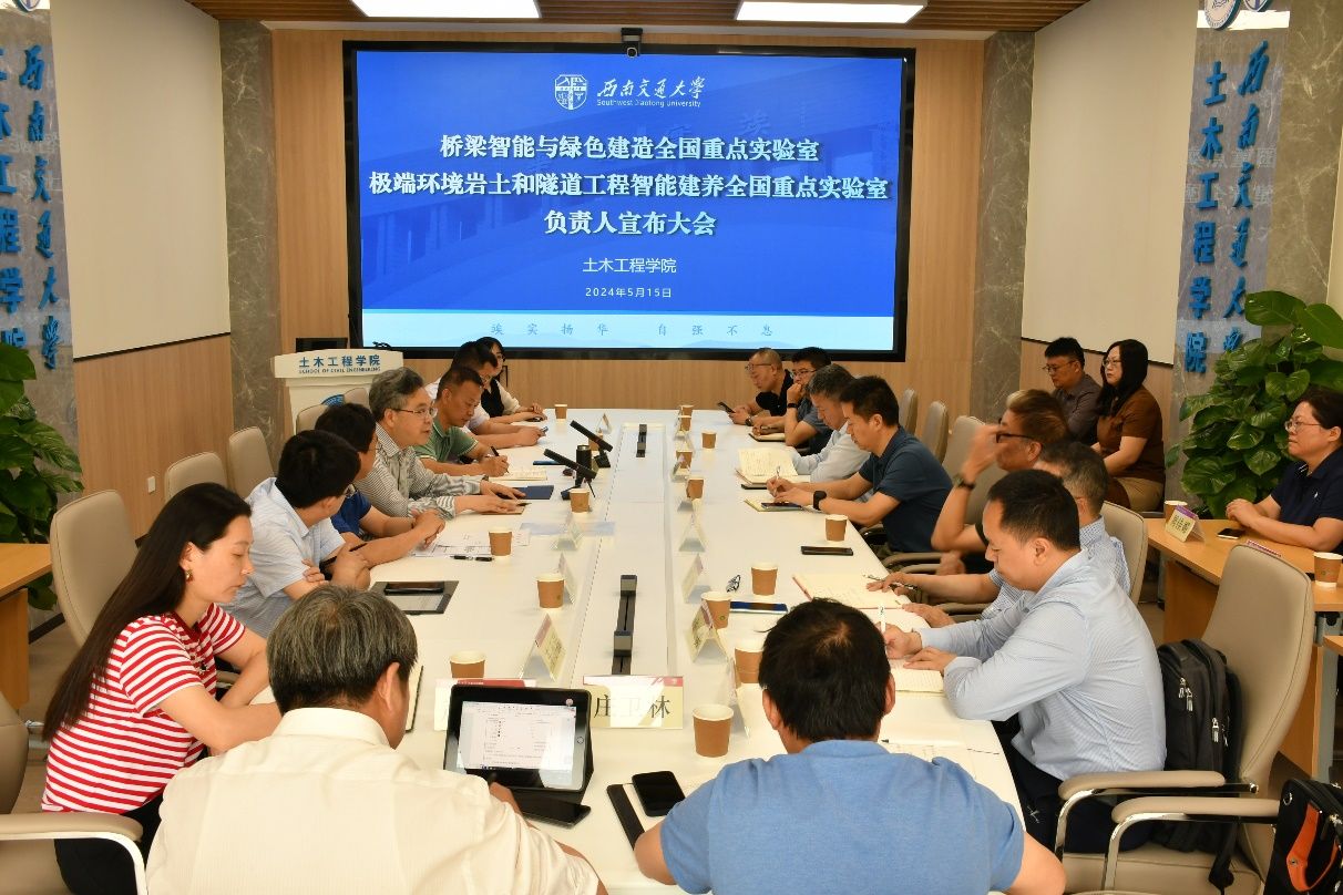 2024年5月15日上午9:30,“桥梁智能与绿色建造全国重点实验室”“极端环境岩土和隧道工程智能建养全国重点实验室”负责人宣布大会在九里工业中心G座一楼会议室顺利召开。学校副校长、中国工程院院士何川,学校人力资源部部长晏启祥, 艳母