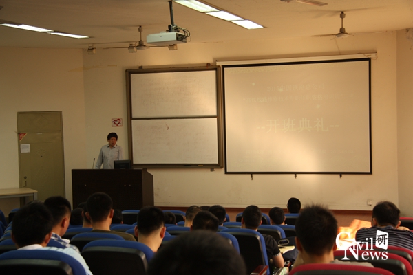 副院长任宝良教授上台讲话。任副院长简要介绍了学校119年的悠久历史,并表明学校在历史发展中,铁路相关专业不断发展和壮大,逐渐形成了西南交大在铁路方面的绝对优势。任副院长表达了学院对铁路总公司此次下达的培训任务的重视,也希望各位学员,作为总公司的骨干力量,能珍惜并充分利用这次培训机会,增加自己的知识储备,提高自己的专业能力。结合当前我国高铁事业的不断发展,任副院长指出工程发展对线路维修的技术从业人员提出了新要求。他说到,培训班将采用培训与测试相结合的方式,保证培训质量,检验培训效果,希望大家认真对待培训内容,遵守考勤制度,在最后的测试环节能达到80分的合格线。最后,任副院长嘱咐大家多注意天气变化,照顾好自己的饮食起居,避免出现水土不服的现象。