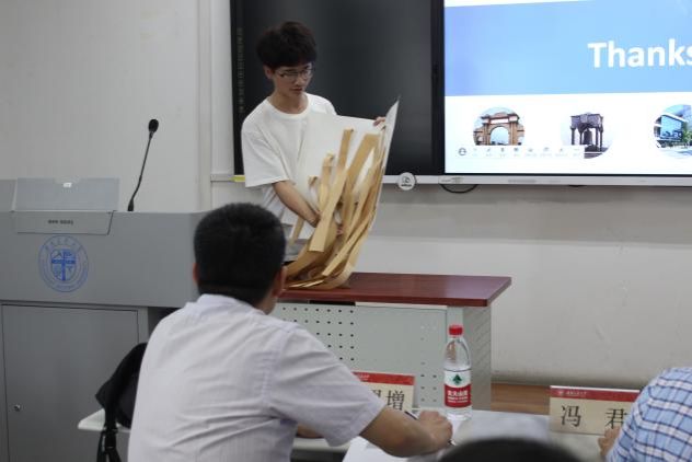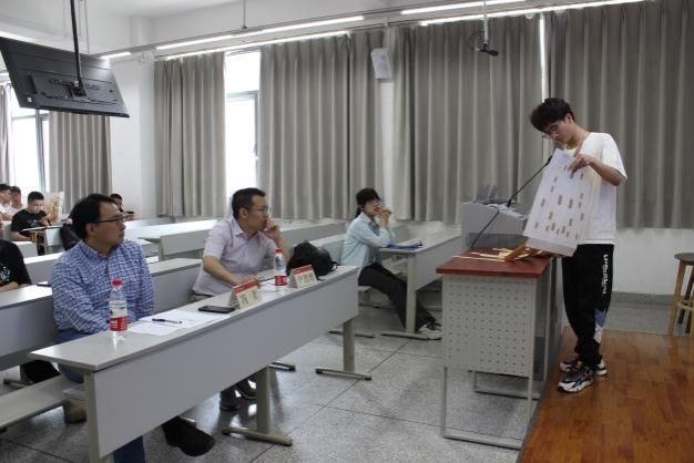 答辩正式开始,各个小组分别派出一名组员上前递交模型的设计报告书,并结合PPT对本小组加筋挡土墙模型的设计理念、分析计算过程与模型的创新之处进行介绍,各位评委老师依据同学们的介绍提出了一些关于模型设计思路与计算方面的问题,然后结合自身的专业知识与实际经验指出各小组挡土墙模型的不足并提出具体的改进思路。