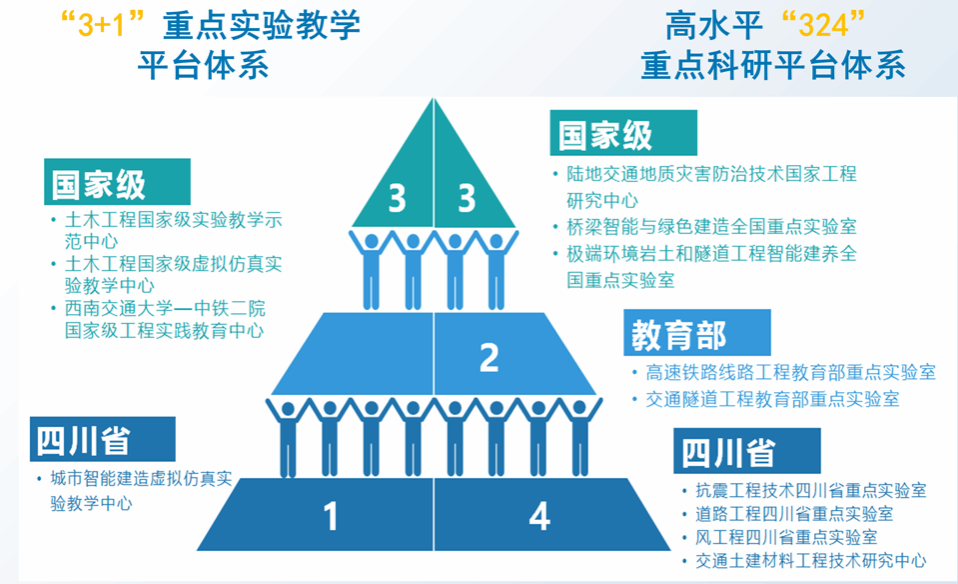近年来,学院充分发挥现有的学科优势和平台优势,突出战略导向,配合新一轮的改革任务,积极打造科教融合、协同育人的创新平台。2021年,陆地交通地质灾害防治技术国家工程实验室成功纳入新序列,转建为陆地交通地质灾害防治技术国家工程研究中心。2023年,新增“桥梁智能与绿色建造”、“极端环境岩土和隧道工程智能建养”两个全国重点实验室,构建起国内领先、国际一流的“3国、2部、4省”重点科研平台体系。